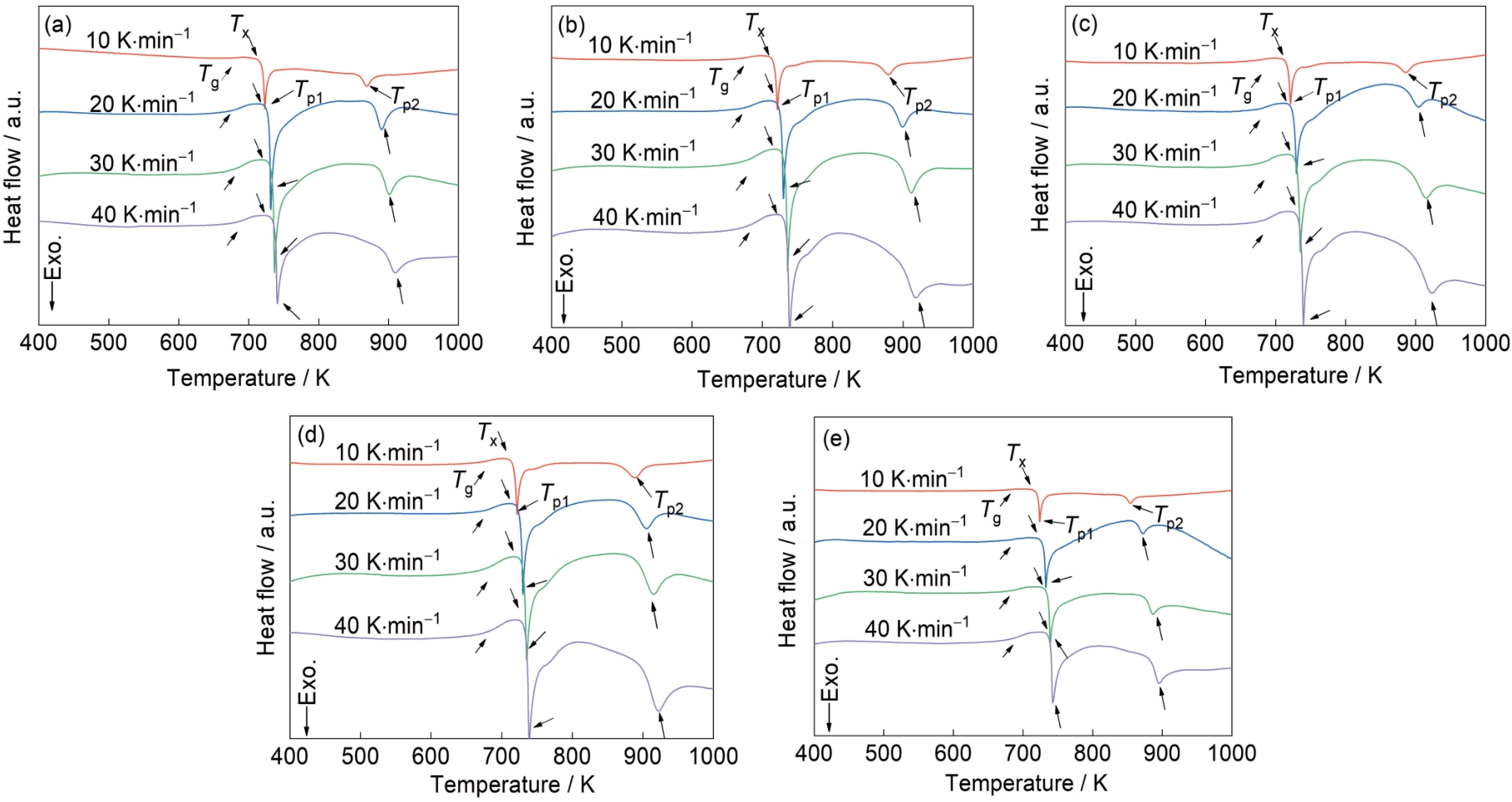 | Fig.3 DSC curves of Zr55Ti3Cu32 - x Al10Ag x BMGs at different heating rates (Tp1, Tp2—the first and second crystallization peak temperatures, respectively) (a) x = 0 (b) x = 1 (c) x = 1.5 (d) x = 2 (e) x = 2.5 |