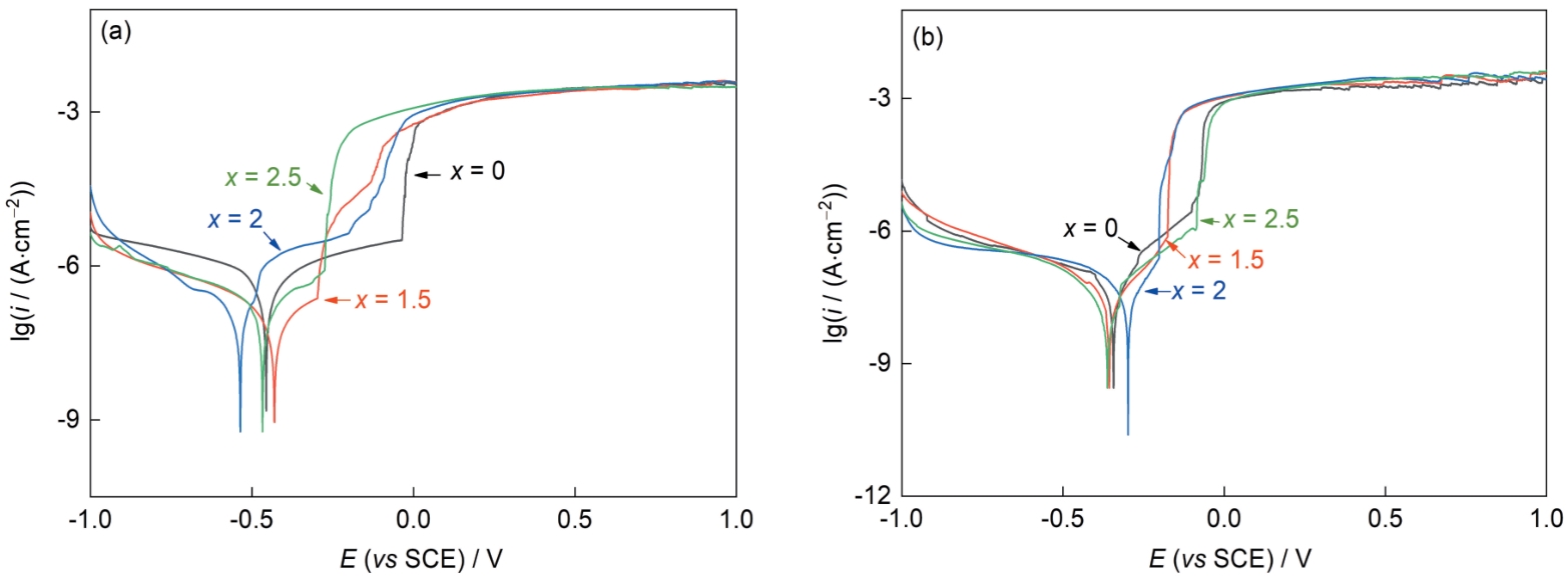 | Fig.8 Potentiodynamic polarization curves of Zr55Ti3Cu32 - x Al10Ag x BMG in two kinds of solution (i—current density, E—potential, SCE—saturated calomel electrode) (a) phosphate buffer saline (PBS) (b) simulated body fluid (SBF) |