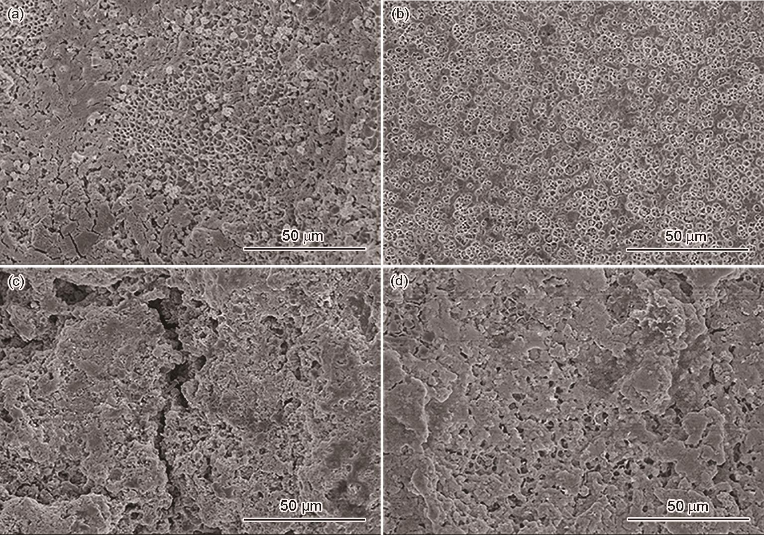 | Fig.9 SEM images of Zr55Ti3Cu32 - x Al10Ag x BMG corroded surfaces in two kinds of solutions (a) x = 0, PBS (b) x = 1.5, PBS (c) x = 0, SBF (d) x = 2, SBF |