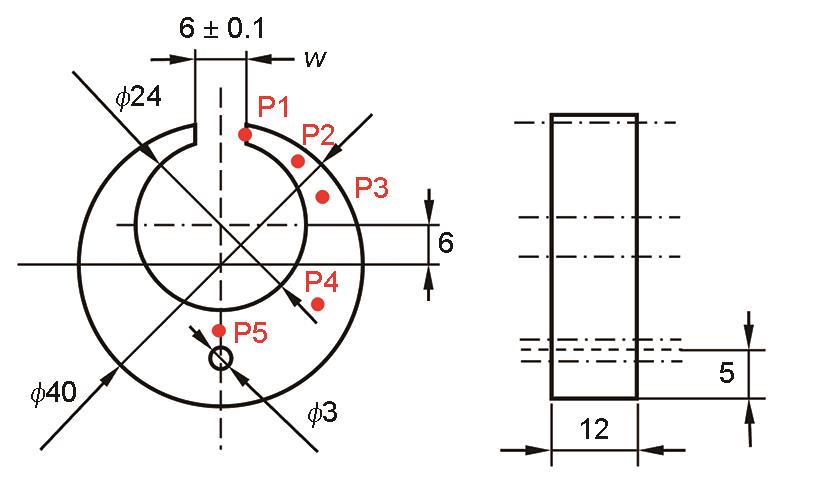 | Fig.1 C-notch specimen for the measurement of quenching deformation and 5 characteristic points (P1-P5) of the geometrical model for numerical simulation (unit: mm. w—width) |
