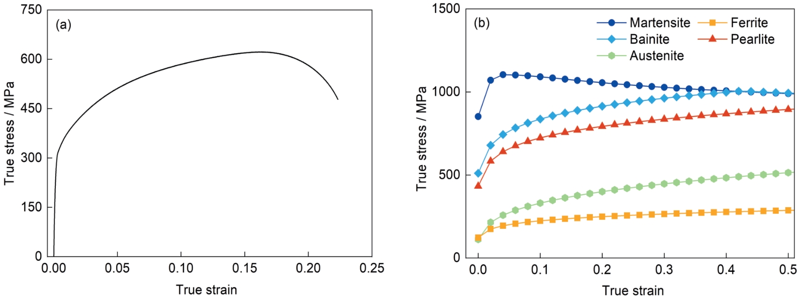 | Fig.3 Tensile true stress-strain curve at ambient temperature (a) and the simulated flow stress curves of the theoretical constituent phases (martensite, bainite, austenite, ferrite, and pearlite) at 500 oC (b) for 16MnCrS5 gear steel with a grain size of 22 μm |
