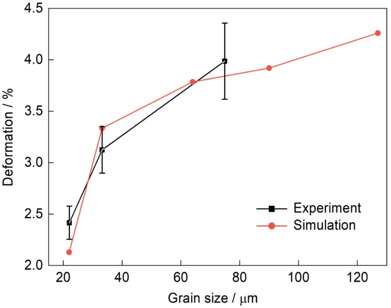 | 图6 淬火变形实验和数值模拟获得的16MnCrS5齿轮钢C型缺口试样淬火变形量随晶粒尺寸变化 |