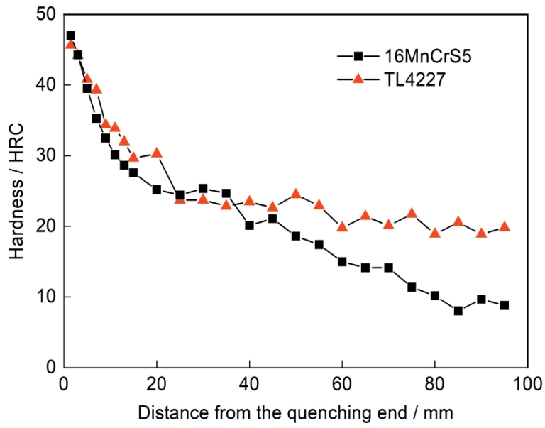 | 图10 16MnCrS5齿轮钢与TL4227齿轮钢Jominy硬度曲线 |