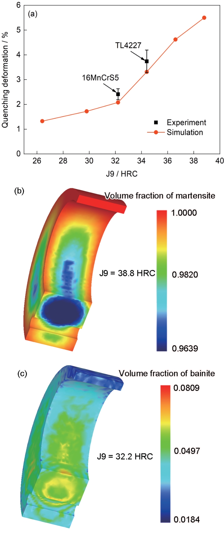 | Fig.11 Quenching deformations of the 16MnCrS5 and TL4227 C-notch samples obtained by experiment and that of the 16MnCrS5 structural models with different hardenabilities calculated by simulation (a), martensite transformation distribution of the sample with J9 = 38.8 HRC (b), and bainite transformation distribution of the sample with J9 = 32.2 HRC (c) |