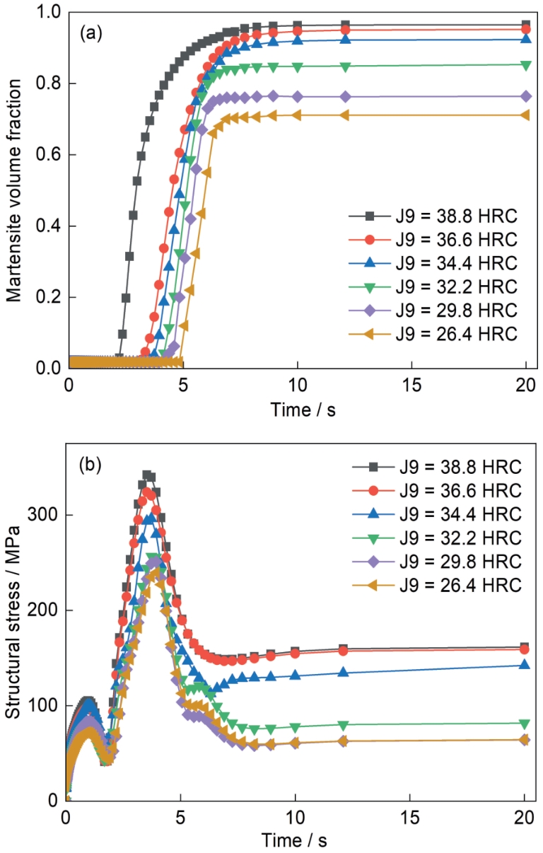 | Fig.12 Numerical simulated martensite volume fraction (a) and structural stress (b) change curves as function of time at P4 of the C-notch samples with different hardenabilities during quenching |