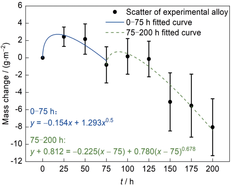 | 图4 镍基高温合金在960 ℃含5%HCl气氛中腐蚀0~200 h的动力学曲线散点及分段拟合结果 |