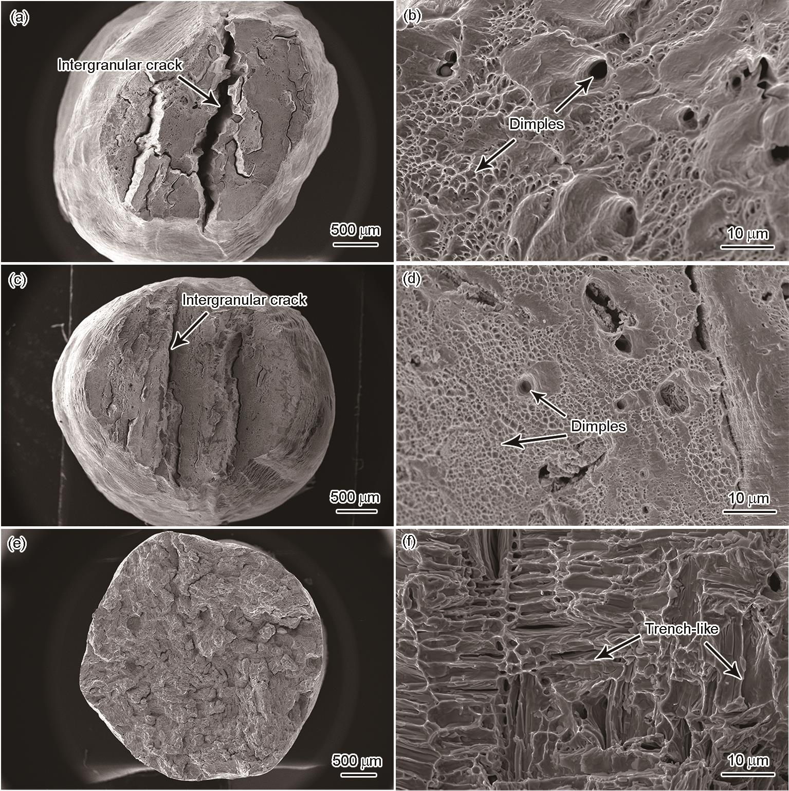 | Fig.5 Low (a, c, e) and high (b, d, f) magnified SEM images of fracture surfaces of 0Nb (a, b), 3Nb (c, d), and 9Nb (e, f) steel samples after tensile test at 100 oC |