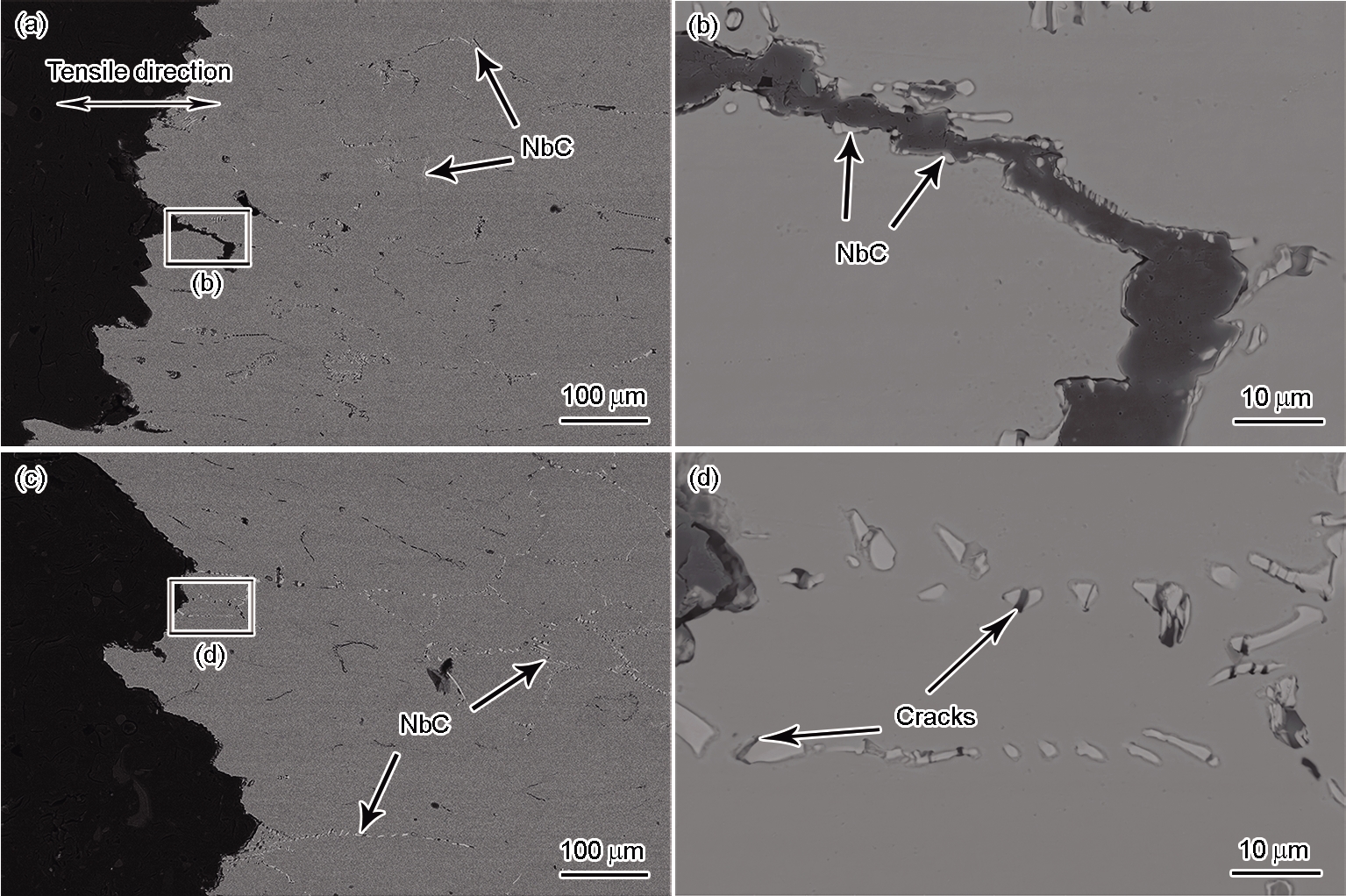 | Fig.8 Low (a, c) and locally high (b, d) magnified SEM images of the longitudinal section near fracture surface in 9Nb steel sample after tensile test at room temperature (a, b) and 550 oC (c, d) |