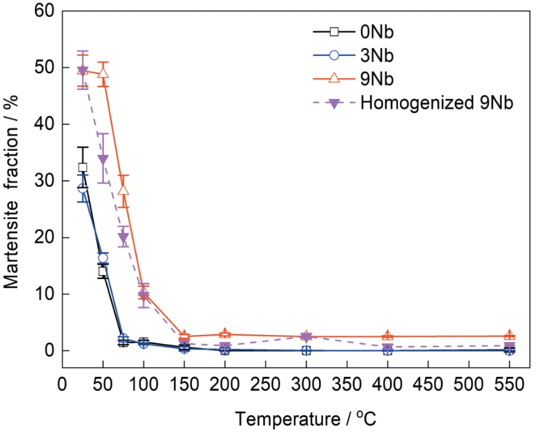 | Fig.12 Volume fractions of deformation-induced martensite after tensile fracture at different temperature in 0Nb, 3Nb, 9Nb, and homogenized 9Nb steel samples |