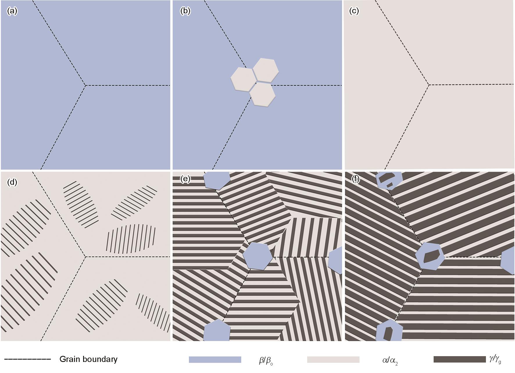 | Fig.9 Schematics illustrating the phase transformation of the Ti-Al-Mn-Nb alloy during cooling (a) primary β phase (b) precipitation of α from β phase (c) transformation of the β phase into the α phase completely (d) precipitation of γ lamellae from the α phase (e) precipitation of βo from the lamellar colony (f) precipitation of γg from the βo phase |