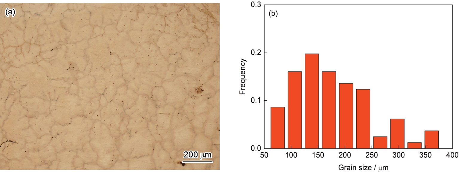 | Fig.1 OM image (a) and grain size distribution (b) of as-cast Mg-5Zn alloy |