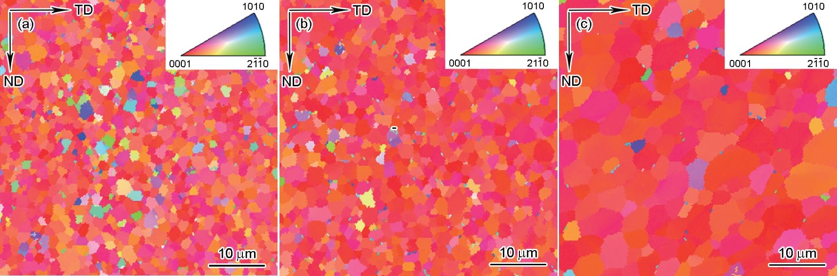 | Fig.2 Inverse pole figures of Mg-5Zn alloys treated by friction stir processing (FSP) with shoulder diameters of 14 mm (a), 17 mm (b), and 20 mm (c) named FSP-14, FSP-17, and FSP-20, respectively (ND—normal direction, TD—transverse direction) |