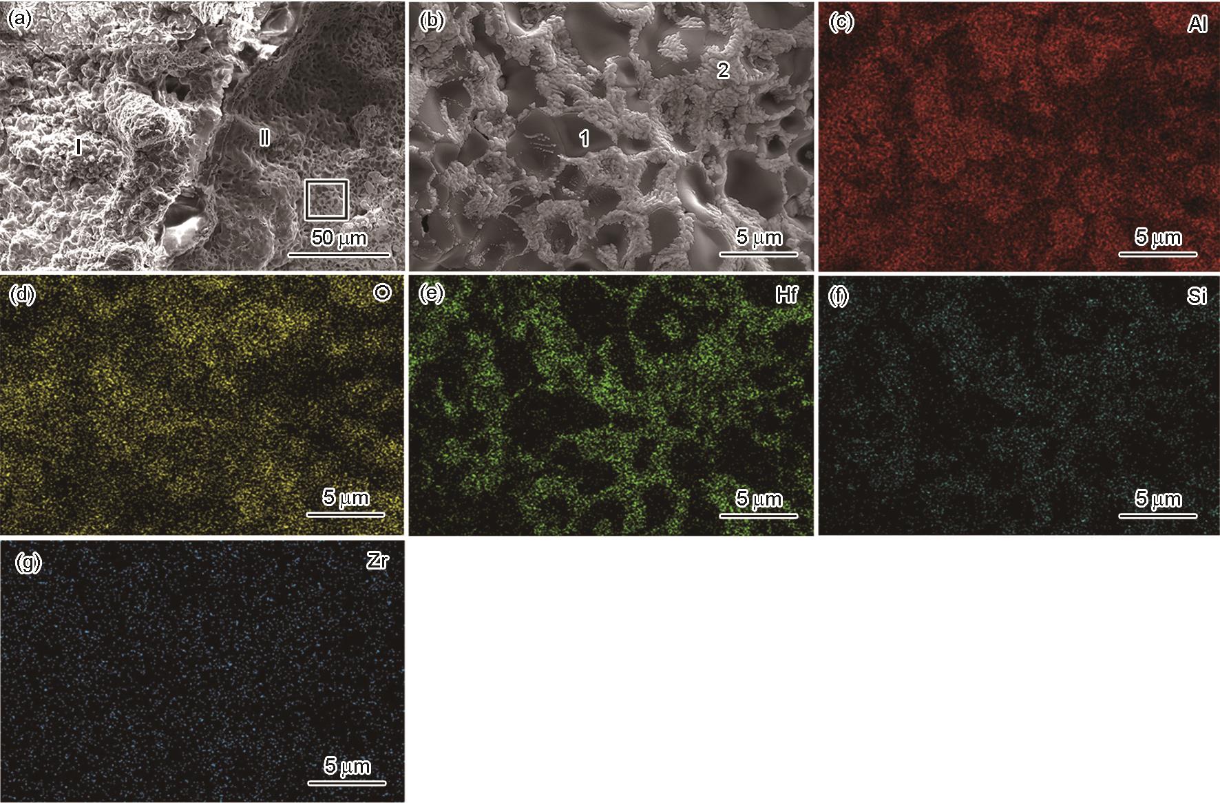 | Fig.8 Surface morphologies (a, b) and EDS analyses (c-g) of the Al2O3-coated Si-based ceramic core after reaction with Ni-based single-crystal superalloy (a) overall morphology (I and II—non-contact area and contact area between the Al2O3-coated Si-based ceramic core and the Ni-based single-crystal superalloy melt, respectively) (b) microstructure of the black rectangular area in Fig.8a (c-g) EDS mappings corresponding to Fig.8b |