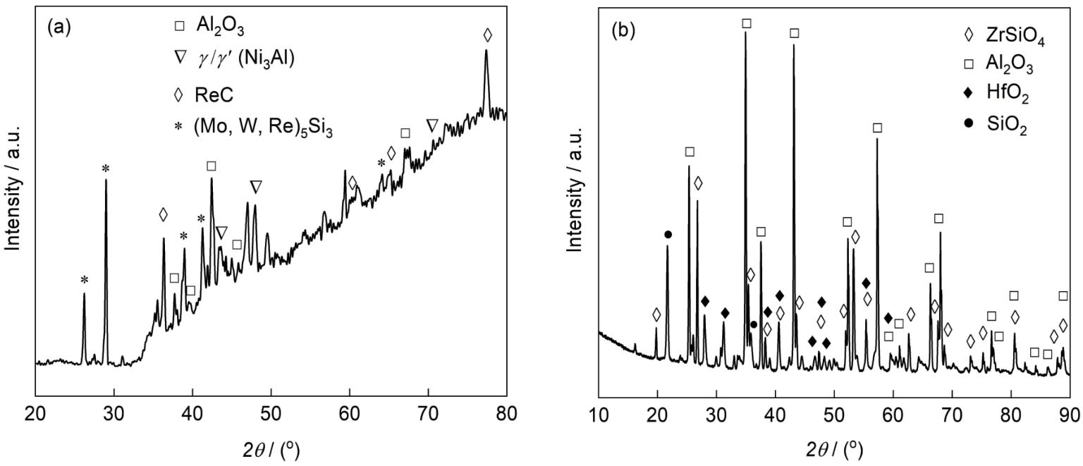 Fig.9 XRD spectra of the Ni-based single-crystal superalloy bottom (a) and the Al2O3-coated Si-based ceramic core surface (b) after interface reaction |