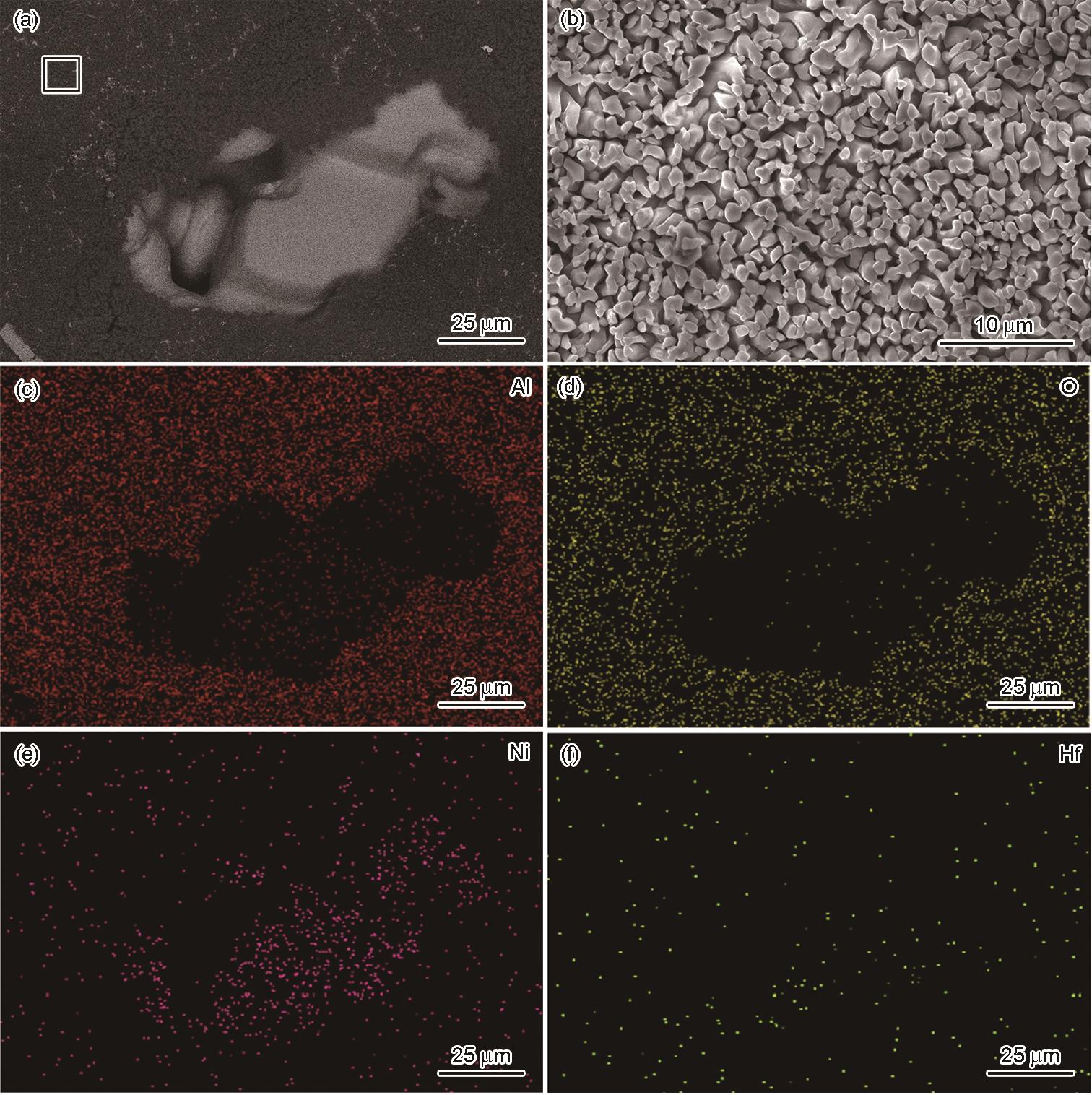 Fig.13 Bottom morphologies (a, b) and EDS analyses (c-f) of the Ni-based single-crystal superalloy after reaction with the unmodified Si-based ceramic core (a) overall morphology (b) microstructure of the black rectangular area in Fig.13a (c-f) EDS mappings corresponding to Fig.13a |