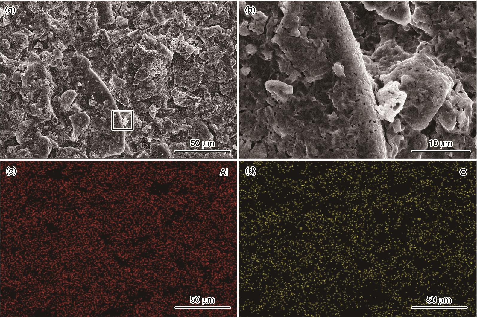 Fig.15 Low (a) and high (b) magnified SEM images showing surface morphologies of the unmodified Si-based ceramic core after reaction with the Ni-based single-crystal superalloy and EDS mappings corresponding to Fig.15a (c, d) |