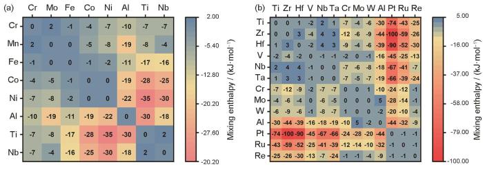 Mixing enthalpies of common elements in fcc-structured (a) and bcc-structured refractory (b) multi-principal element alloys (MPEAs)