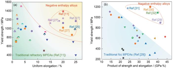 (a) comparisons of yield strength and uniform elongation of bcc-structured refractory MPEAs (Compared with traditional refractory MPEAs[11], negative enthalpy alloys[11,25,27] exhibit excellent mechanical properties)
