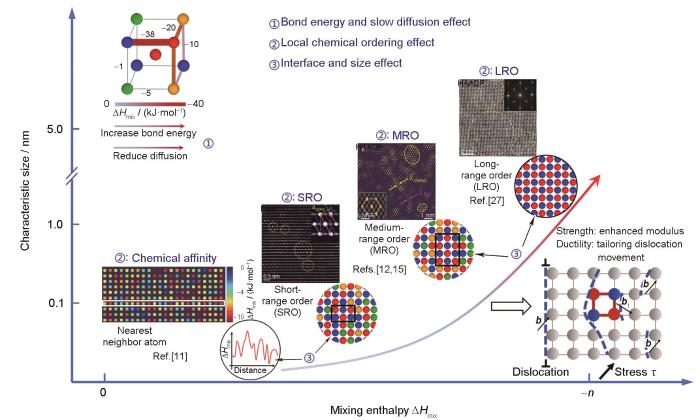 负焓合金化的本质在于基于热力学第一定律,利用元素间的偏好性和排斥性,调控元素间的化学相互作用,设计、加工制造材料微观结构中的有序度、有序分布及局域电子态,从而调控材料的力学性能。本节总结负焓合金化至少带来的3重效应。