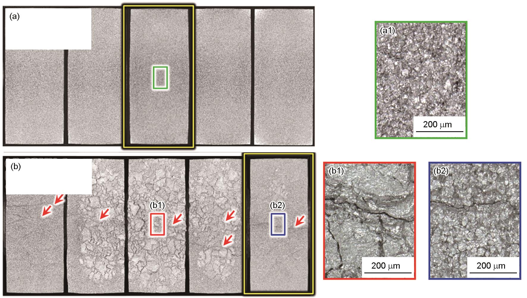 Fig.4 Low (a, b) and high (a1, b1, b2) magnified surface morphologies of W monoblock in small-scale W monoblock divertor mock-up (SSMU) after high heat loading test (HHFT)[ (a, a1) ALMT-W (b, b1, b2) NSCM-W |