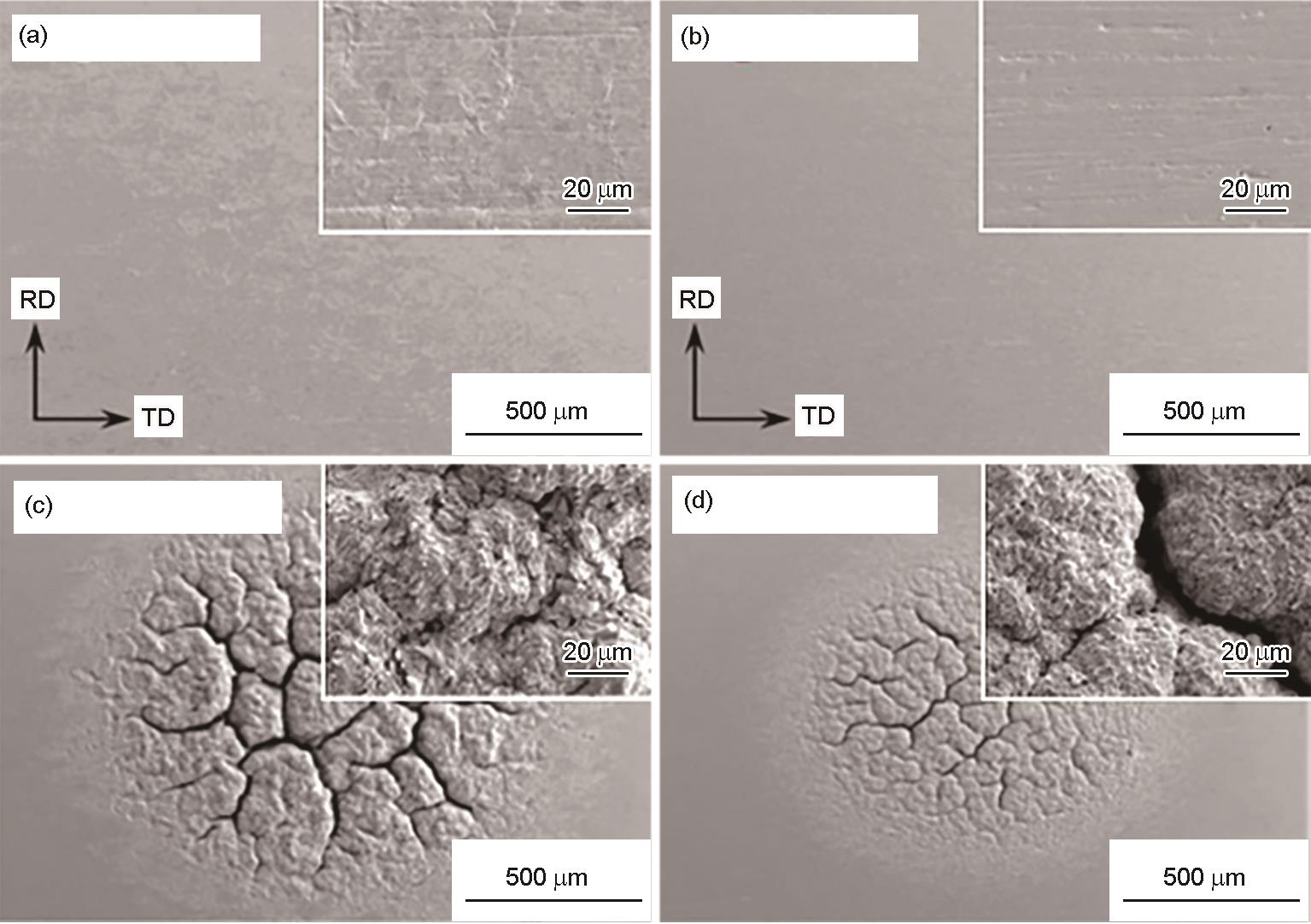 Fig.6 Low and high (insets) magnifed SEM images of surface of pure W (a, c) and W-3%Ta alloy (b, d) after thermal shock tests with background steady state D-plasma exposure under 700 oC base temperature and 0.38 GW/m2 laser power density[ (a, b) 103 pulse (c, d) 105 pulse |