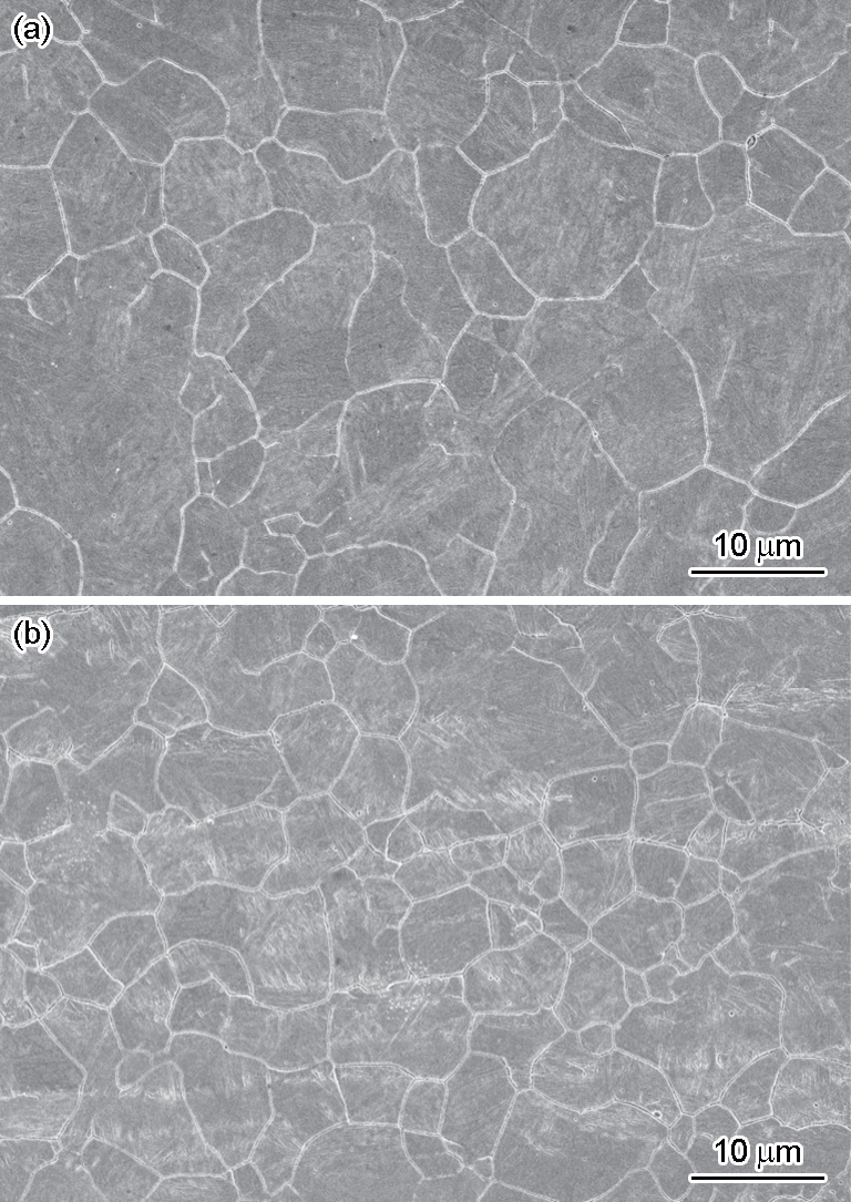 | Fig.4 SEM images of original austenite grain bound-aries in test steel after austenitizing at 910 oC (a) and 850 oC (b) for 30 min |