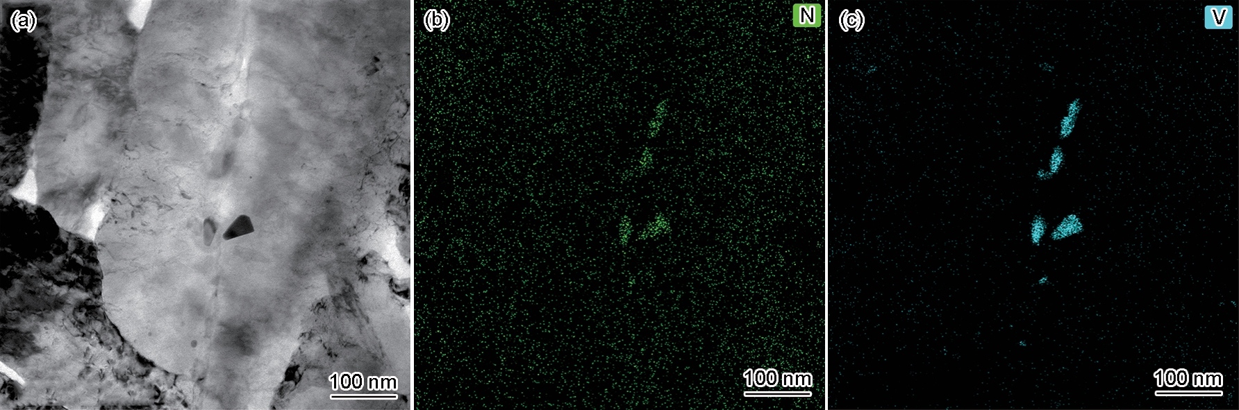 | Fig.7 Bright field TEM image (a) and elemental mappings of N (b) and V (c) of the test steel quenched after austenitizing at 850 oC for 30 min |