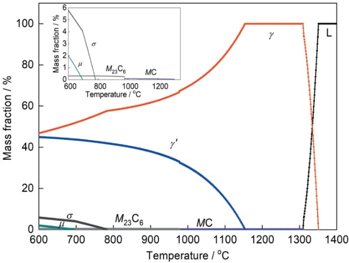 Equilibrium phase diagram of GH4720Li alloy (Inset shows the partial enlarged view. L—liquid)