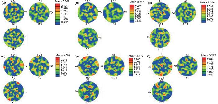 塑性变形会引起晶内位错运动或晶界滑动,导致原本取向相同取向成像的晶粒在不同区域产生取向差,晶粒取向分布图可以展现出合金的塑性变形情况以及不同晶粒取向的集中程度。极图中的等高线可清楚显示各织构的强度差别和锋锐程度。图7和图8a1~f1分别为2种合金的极图和晶粒取向分布图。图中没有出现大面积的同种颜色,颜色分布没有特定规律,较分散,表明晶粒取向分布比较均匀。GH4720Li合金晶内无明显取向差,FGH4720Li合金中部分晶粒内存在明显取向差,表明其塑性变形主要集中在晶粒内部。由图7可见,虽然2种合金极图存在小面积的晶体学取向高密度区域,但最高密度强度处仅为3.66,表明2种合金的晶向呈随机分布,未发现明显的择优取向。