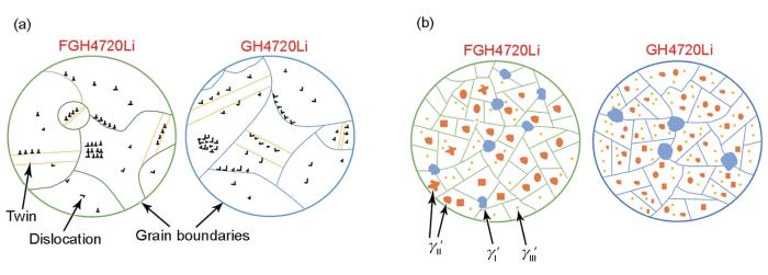 Schematics showing microstructure similarities (a) and differences (b) of FGH4720Li and GH4720Li alloys