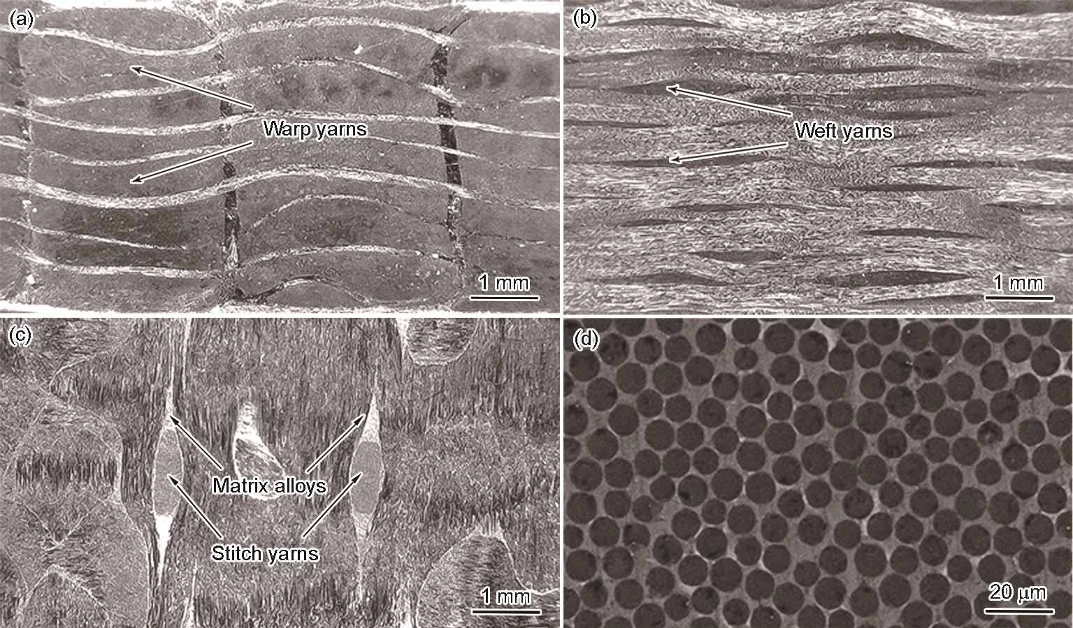| Fig.3 Cross-sectional OM images (a-c) and SEM image (d) of yarns in the aluminum matrix composites (a) warp yarns (b) weft yarns (c) stitch yarns (d) microstructure of warp yarns  |
