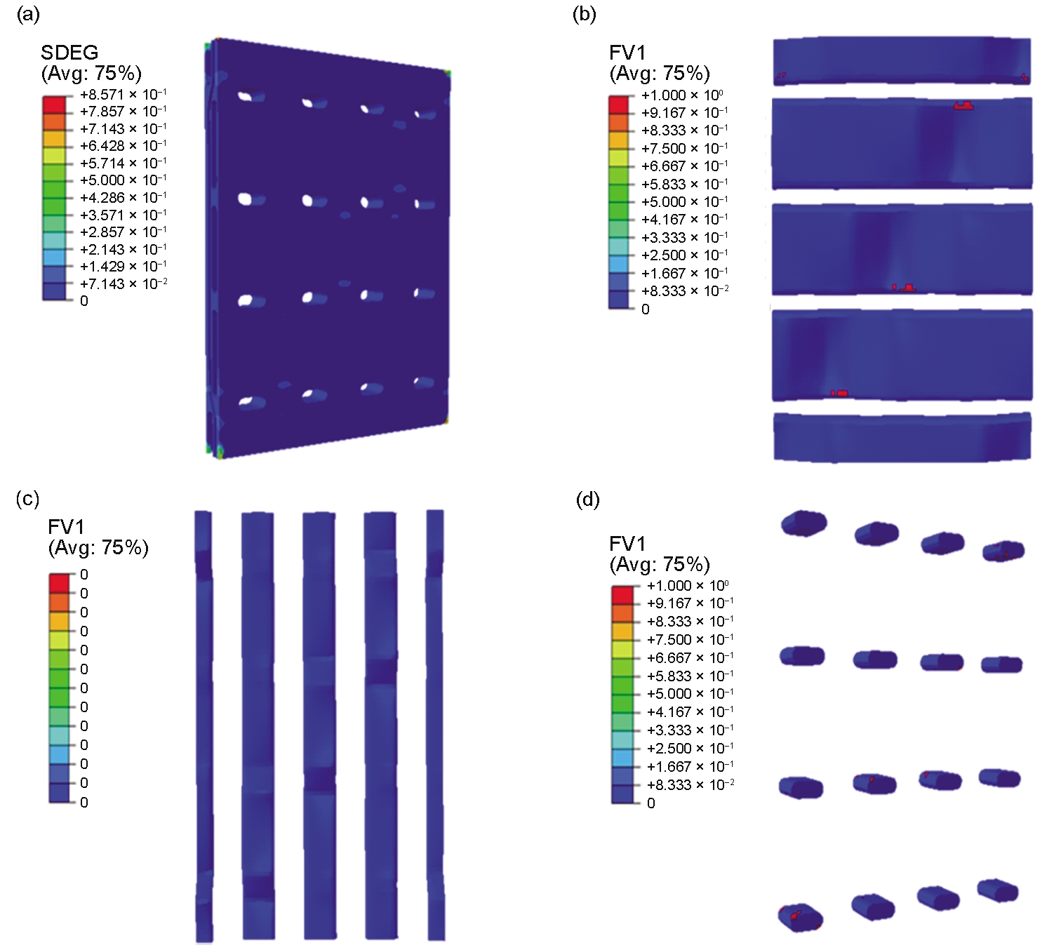 | Fig.12 Local damage and failure state of the component structures at the tensile strain of 0.2009% (SDEG—damage factor of the matrix pocket, FV1—failure index of the yarns) (a) matrix pocket (b) warp yarns (c) weft yarns (d) stitch yarns |