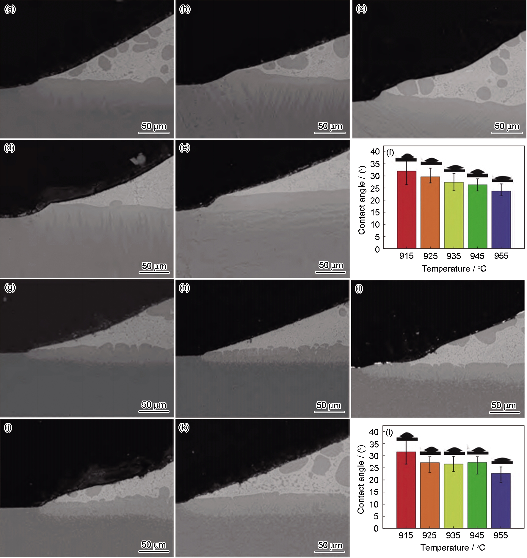 | Fig.1 SEM images of interface microstructures (a-e, g-k) and variations of wetting angles (f, l) of wetted industrial pure Ti (TAl) (a-f) and TC4 alloy (g-l) specimens at different temperatures[ |
