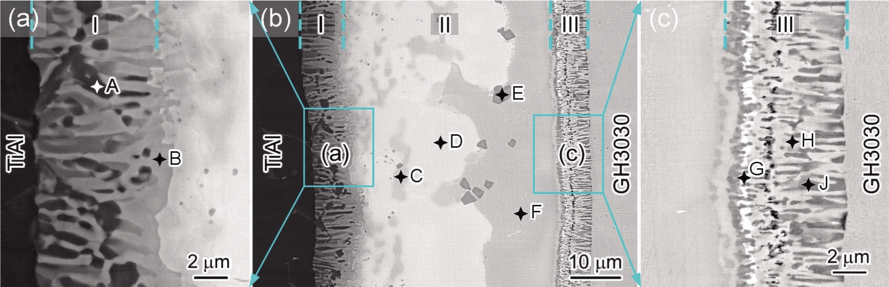 | 图3 TiAl/Ti33.3Zr16.7Cu39Ni11/GH3030接头在960 ℃钎焊10 min后显微组织的SEM像[ |