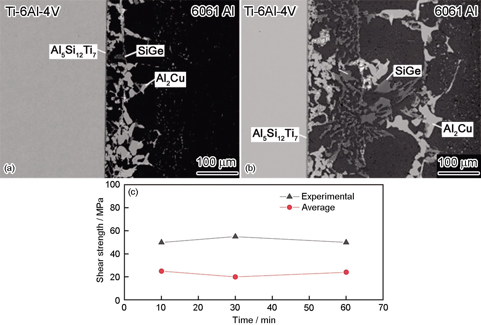 | Fig.4 SEM images (a, b) and shear strengths (c) of brazed joints of 6061 aluminum alloy and Ti-6Al-4V titanium alloy[ (a) initial microstructure (b) microstructure after introduction of rare earth elements |