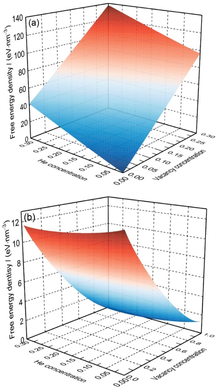 Free energy densities of matrix (a) and He bubble (b) at 550 oC in the phase field model of He bubble evolution