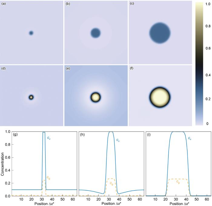 随着计算机模拟技术的发展,研究人员从原子尺度、纳米尺度和微米尺度开展了大量工作,以揭示He泡的形核、生长和粗化过程。原子模拟表明,间隙He原子迁移能低,易于扩散,且由于结合能高,会与空位结合形成He-空位团簇[13]。因此,这些He-空位团簇可作为辐照金属中He泡的形核位点。但由于势函数的限制,分子动力学(MD)在研究He泡的生长和演化方面并未获得大量应用。近年来,介观尺度的相场方法被广泛应用于研究微观结构演变及其对力学性能的影响。基于相场方法,研究人员开展了大量关于核燃料中裂变气体气泡的研究。Stan等[14]和Hu等[15]基于气体原子浓度场(ci)构建了核燃料中气泡的演化,并在随后的研究中进一步引入空位浓度场(cv),该模型能够研究气泡的形核与生长,并有效地模拟了气泡在晶界处的偏聚,但相场能量方程中对气泡的描述较为简单。Millett等[16,17]在热力学框架中引入缺陷形成能,并在控制方程中引入缺陷的产生与复合、湮灭以及晶界的影响。模拟结果表明,气泡的演化经历3个不同的阶段:孕育期,形核和生长期,粗化期;模拟的气泡稳定生长的动力学规律与传统的Johnson-Mehl-Avarami理论吻合较好。Li等[18]采用类似的热力学框架,并基于Kim-Kim-Suzuki (KKS)相场模型研究了UO2中晶内裂变气泡的演化,发现气泡数密度的对数与直径的对数呈线性关系,与实验结果吻合良好。由于气泡内部存在较大的内压,弹性作用在气泡的演化过程中起着重要作用,在最近的研究中,研究人员在相场模型中进一步引入缺陷的弹性相互作用[19,20]。Jiang等[21]研究发现,弹性应变能在He泡演化初期影响较小,在后期则会抑制He泡的生长。