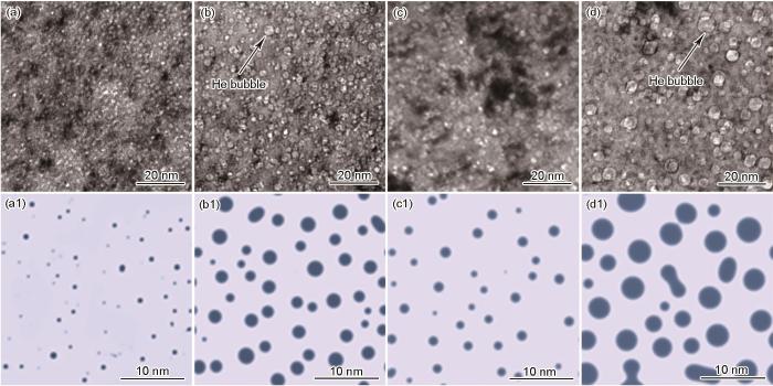 (c, c1, d, d1) He bubble in 316H WM under the He concentrations of 0.01 (c, c1) and 0.04 (d, d1)