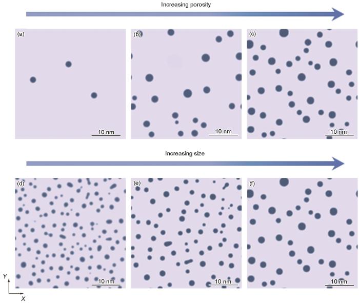 Microstructures of system with the He bubble porosities of 0.6% (a), 5% (b), and 10% (c) and system with the He bubble diameters of 1.1 nm (d), 1.4 nm (e), and 2 nm (h)