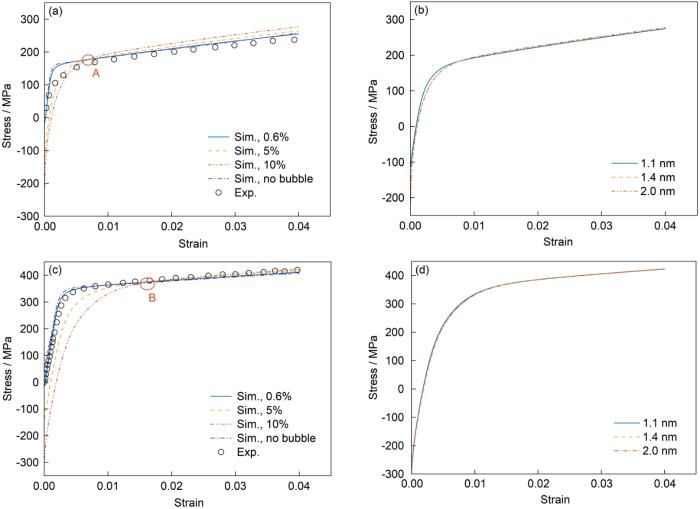 Effects of He bubble porosity (a, c) and size (b, d) in 316H steel (a, b) and 316H WM (c, d) on stress-strain curves unde 550 oC (The circular areas in Figs.13a and c imply the applied strain begins to dominate the mechanical response)