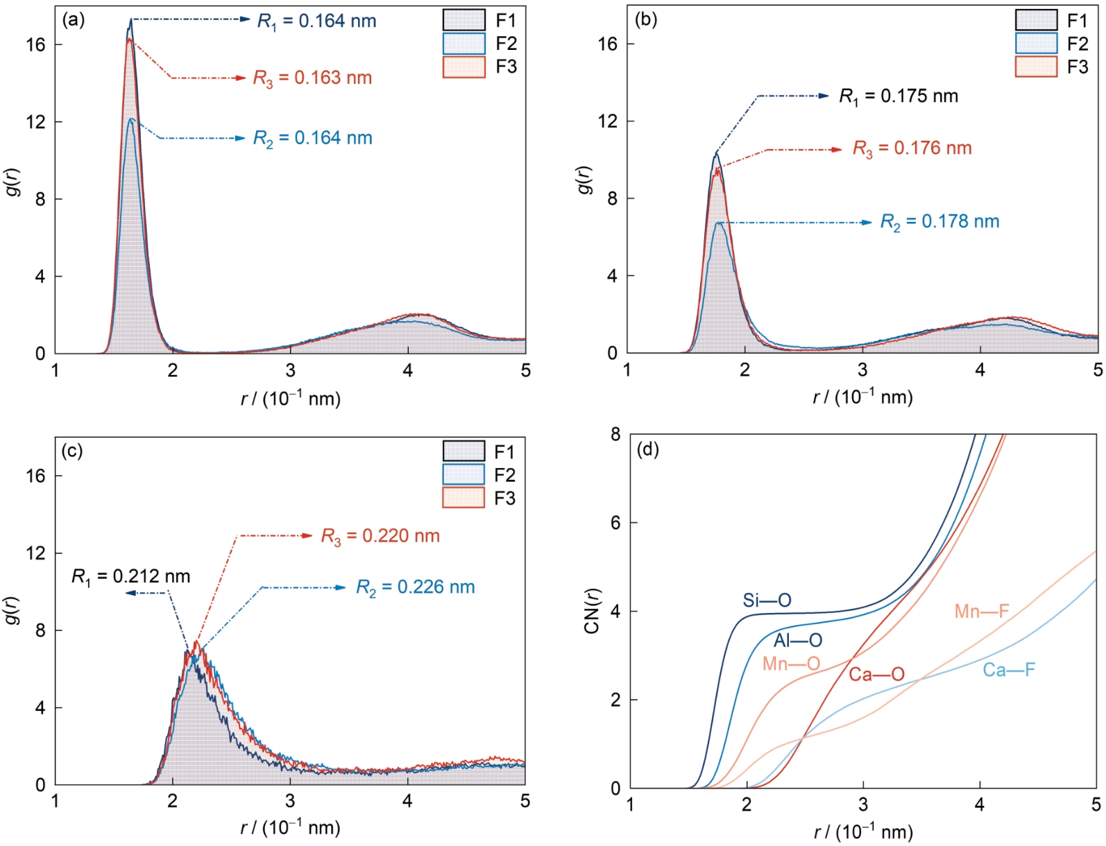 | Fig.2 Structural radial distribution function (RDF) curves of Si-O (a), Al-O (b), and Ca-F (c) atomic pairs in target systems; and coordination numbers (CNs) for various atomic pairs in F3 sample (d) (Ri represents bond length for specific bond i; g(r) and CN(r) represent RDF and CN functions, respectively; r—distance) |