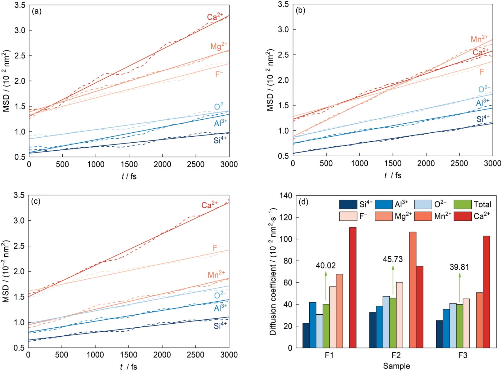 | Fig.4 Mean square displacement (MSD) curves and fitting lines of F1 (a), F2 (b), and F3 (c) samples and diffusion coefficients of ions in target systems (d) (Solid lines and the dashed lines represent fitted data and original data, respectively; t—time) |