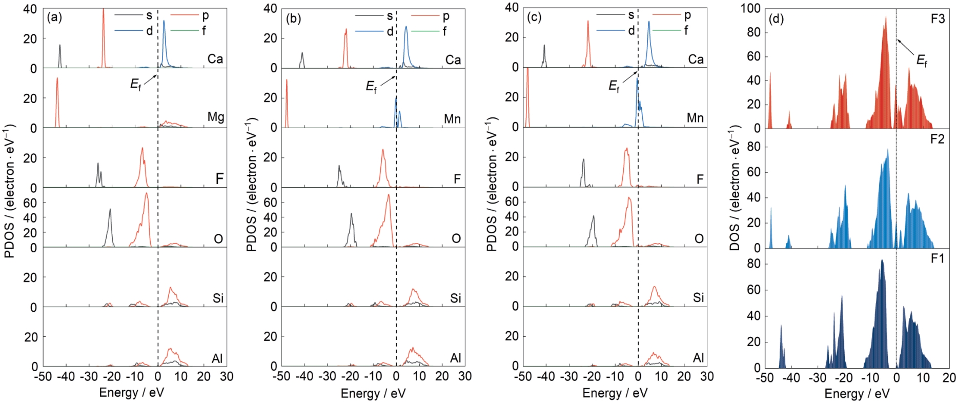 | Fig.6 Partial density of states (PDOS) of different atoms in F1 (a), F2 (b), and F3 (c) samples and total density of states (DOS) (d) (Ef—Fermi level) |
