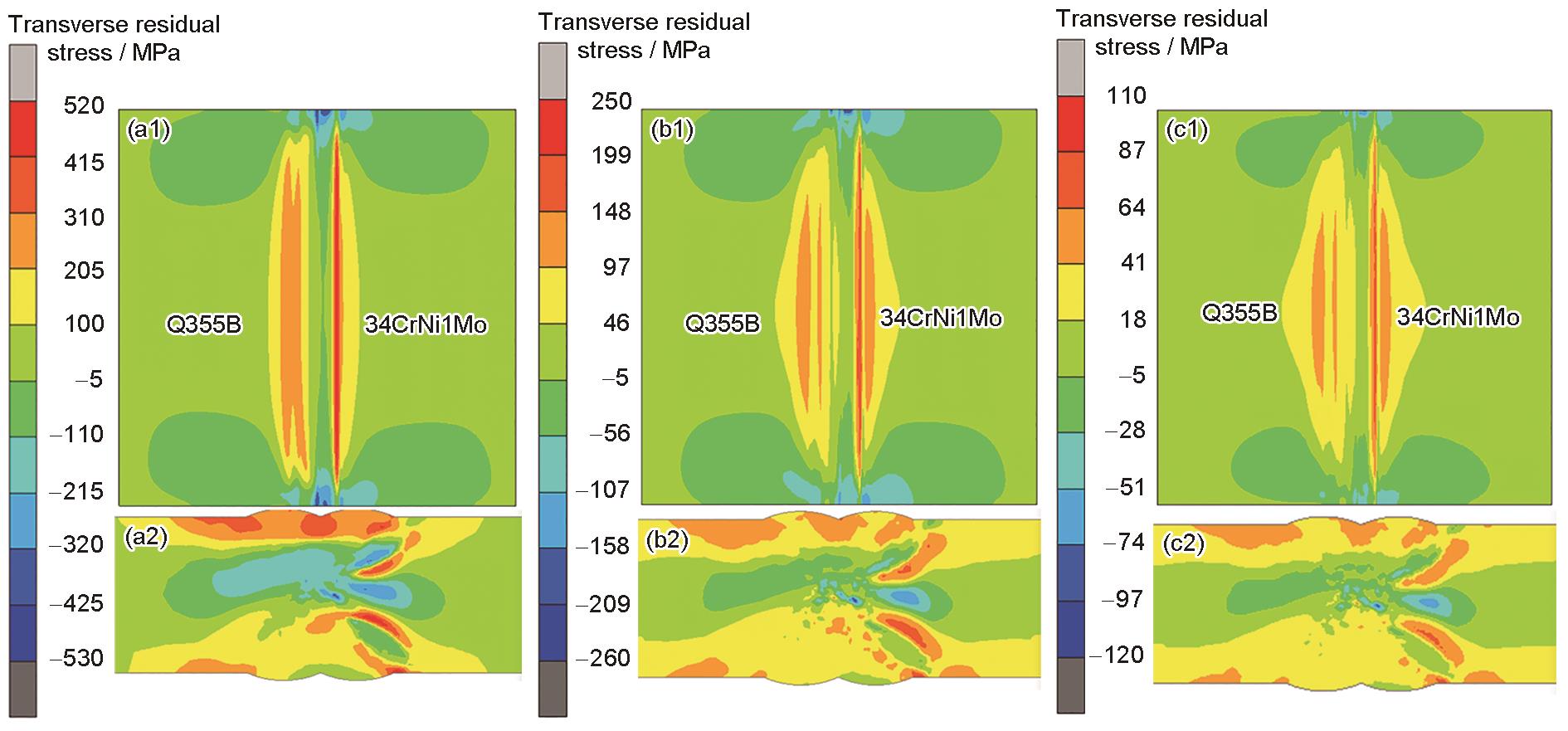 | Fig.17 Contours of transverse residual stress distribution on the lower surface (a1-c1) and middle cross-section near the weld (a2-c2) of 34CrNi1Mo and Q355B butt joint in case B (a1, a2), case C (b1, b2), and case D (c1, c2) |