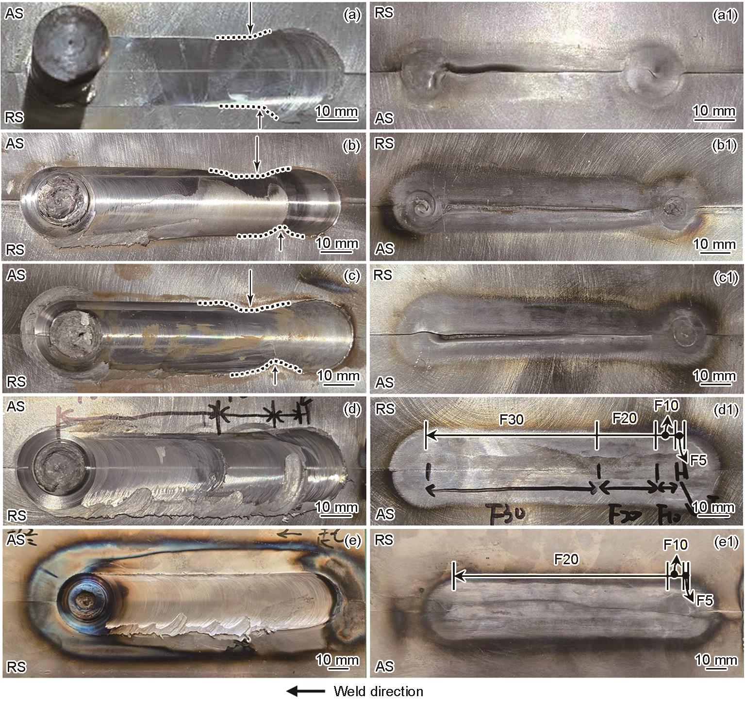 | Fig.3 Macroscopic morphologies of front (a-e) and back (a1-e1) sides of the weld in joints obtained using WC-Co holder under different rotation speeds and welding speeds (Black arrows in Figs.3a-c represent weld necking; F5, F10, F20, and F30 represent welding zones at welding speeds of 5, 10, 20, and 30 mm/min, respectively. The same below) (a, a1) 300 r/min, 80 mm/min (b, b1) 300 r/min, 50 mm/min (c, c1) 350 r/min, 50 mm/min (d, d1) 500 r/min, 30 mm/min (e, e1) 500 r/min, 20 mm/min |