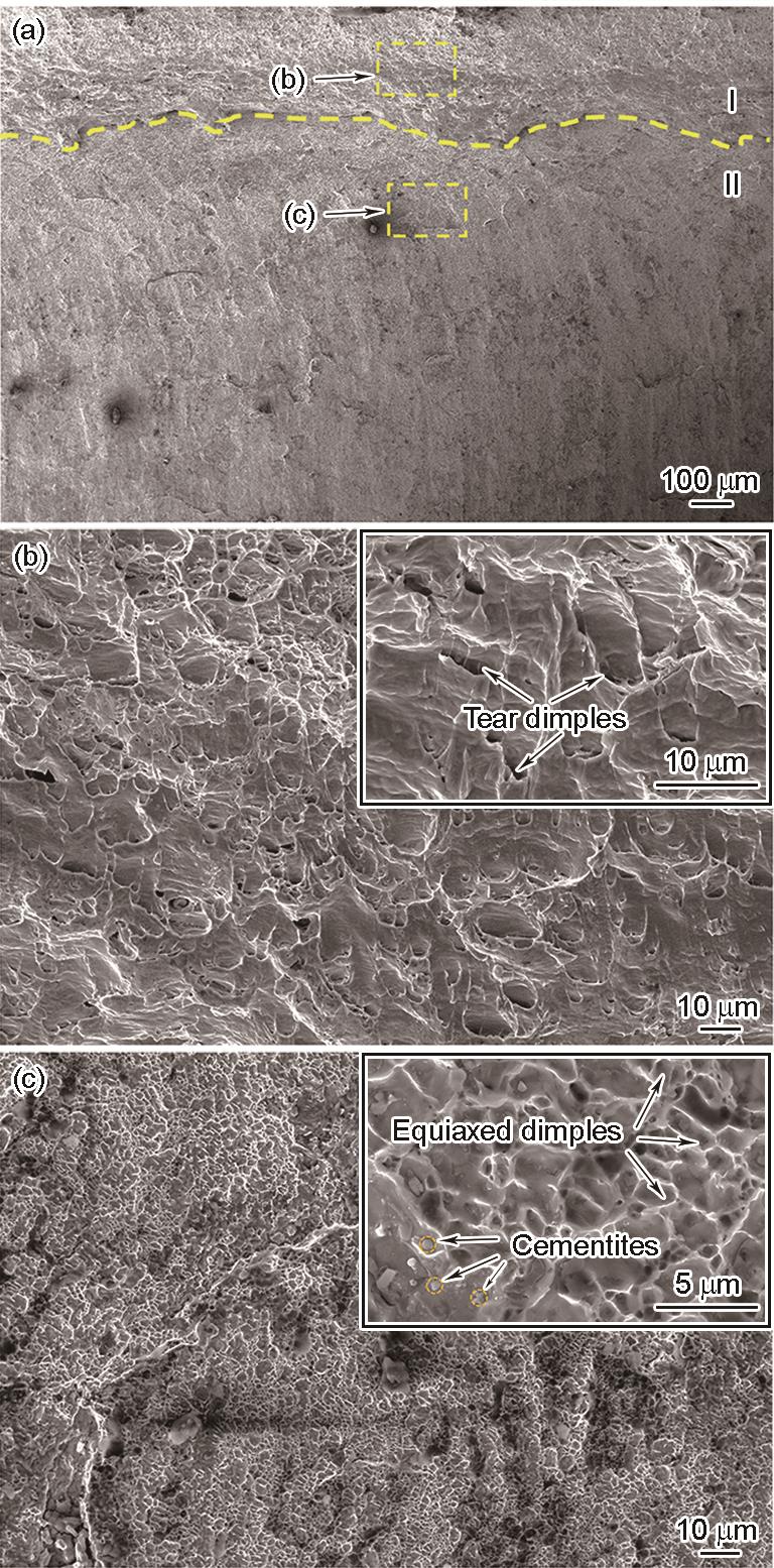 | Fig.14 Low (a) and high (b, c) magnified SEM images showing typical fracture morphologies of samples obtained using WC-Co holder under optimal parameters (Insets in Figs.14b and c are corresponding high magnified views) |