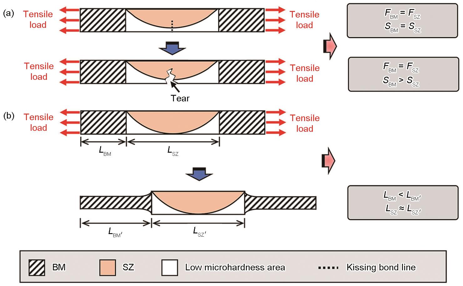 | Fig.17 Schematics of fracture mechanisms of samples obtained using WC-Co (a) and W-Re (b) holders under optimal parameters (FBM—load on the BM region, FSZ—load on the SZ, SBM—cross-sectional area of the BM region, SSZ—cross-sectional area of the SZ, LBM—initial tensile test gauge length of the BM region, LBMʹ—critical gauge length of the BM region before fracture, LSZ—initial tensile test gauge length of the SZ, LSZʹ—critical gauge length of the SZ before fracture) |