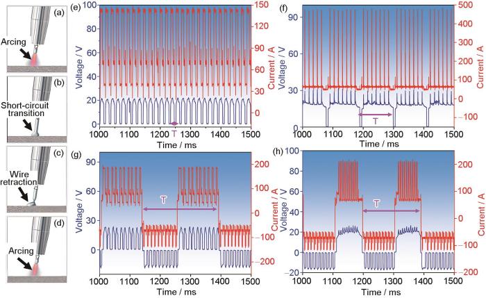 Schematics of droplet transfer (a-d)[29] and waveform diagrams of welding power sources in different CMT modes (e-h) (T means a period of the welding power)