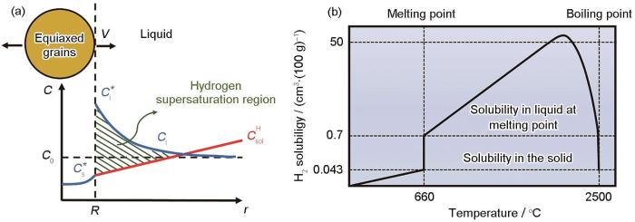 ... ,47]Schematics of hydrogen supersaturation during the solidification process[47] (a) and solubility of hydrogen in aluminum versus temperature[46] (b) (C—concentration, r—radial distance, V—interface growth velocity, R—radius at the interface, and —hydrogen concentrations in the solid and liquid phases on either side of the interface, respectively, —actual concentration, —solubility of hydrogen in the aluminium melt, C0—initial hydrogen content)Fig.5
