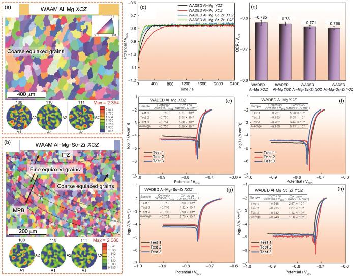 Microstructures and corrosion resistances of WAAM Al-Mg-Sc-Zr alloy[61] (ITZ—inter-layer zone, MPB—molten pool boundary, WADED—wire arc directed energy deposited, i—corrosion current density, OCP—open circuit potential)